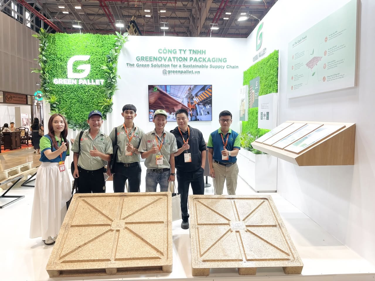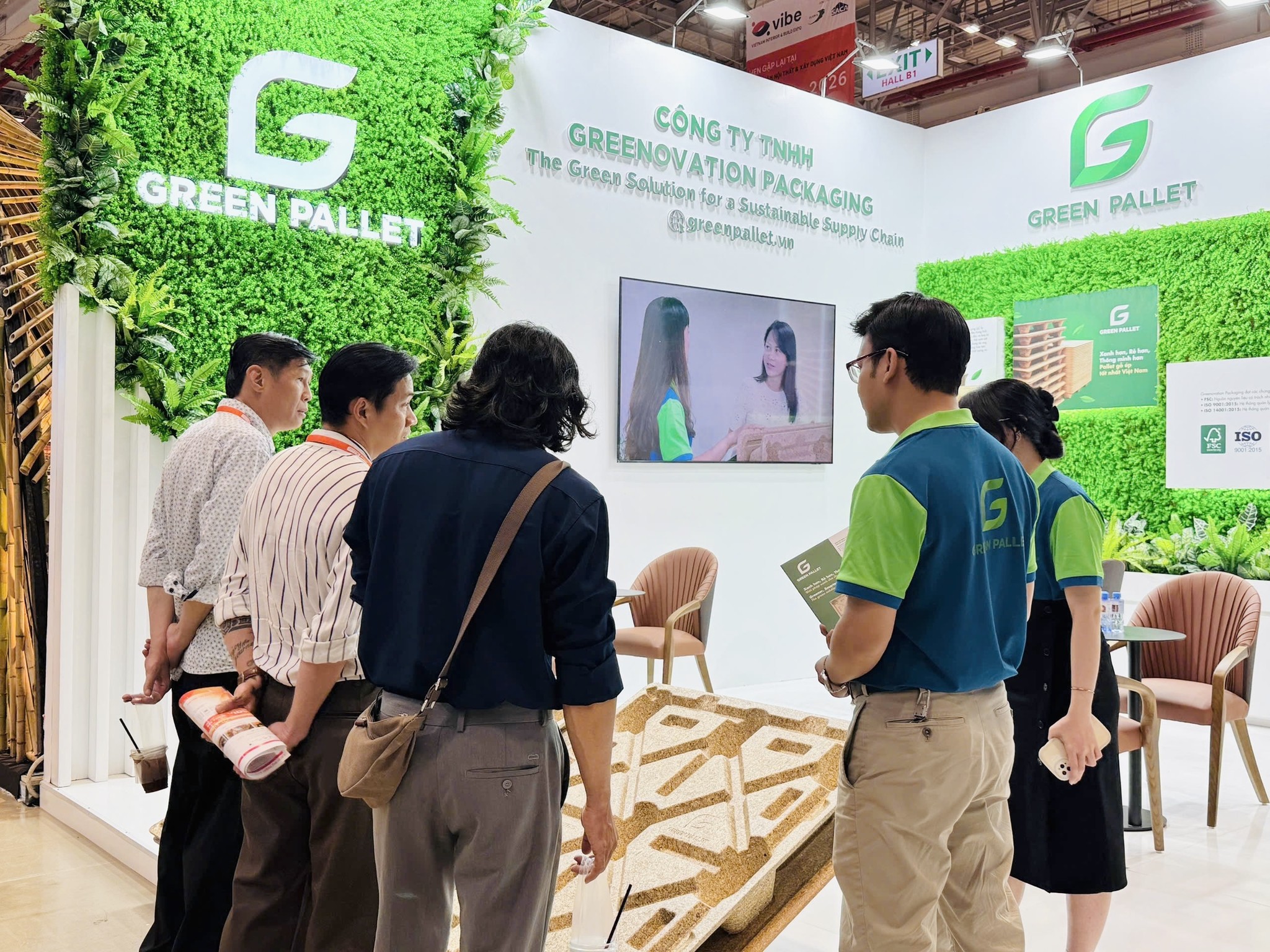 Tại triển lãm, gian hàng của Greenovation Packaging đã nhận được sự quan tâm đặc biệt từ đông đảo khách tham quan nhờ dòng sản phẩm Green Pallet - Pallet gỗ đúc từ gỗ tái chế, thân thiện môi trường, góp phần giảm phát thải carbon và hướng tới chuỗi cung ứng bền vững.
